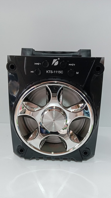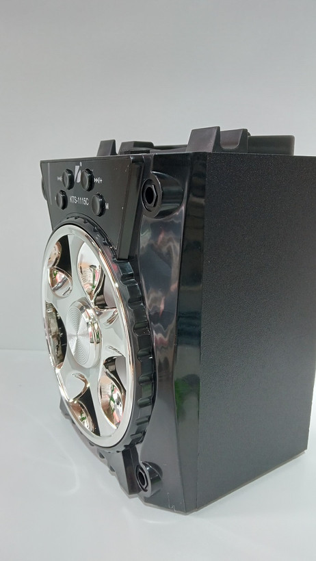 اسپیکر مدل KTS-1115C یک پخشکننده صوتی با طراحی مدرن و ابعاد مناسب است که به راحتی قابل جابهجایی میباشد. این دستگاه از اتصال بیسیم بلوتوث پشتیبانی کرده و دارای پنل مدیریتی در قسمت بالایی برای کنترل موسیقی و تغییر حالت پخش (Mode) است. سابووفر این مدل با پوشش کروم درخشان طراحی شده که در کنار رقص نور داخلی، جلوه بصری بسیار زیبایی در هنگام پخش موسیقی ایجاد میکند.